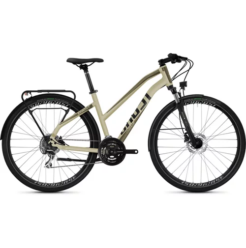 The Square Trekking Base from Ghost is ideal for inner-city errands, urban commutes and weekend countryside adventures. This women’s version features a strong and lightweight alloy frame with an easy step-through geometry, SR Suntour suspension forks and a Shimano Acera 3×8-Speed groupset with Shimano MT200 hydraulic disc brakes. Plus, it’s equipped with a rear carrier rack, front and rear lights and a stand while rolling upon Rodi Excaliber wheels wrapped in Schwalbe Energizer Activ Plus.
